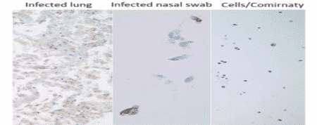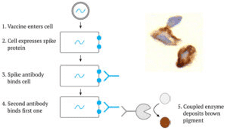 Pildi paremas ülanurgas näete kahte rakku, mis olid kokku puutunud Pfizeri vaktsiiniga ja seejärel allutati ülalkirjeldatud protokollile. Intensiivne pruun plekk näitab, et rakud tootsid tõepoolest piigivalku. Lühidalt, kõikjal, kus pruun pigment ladestub, peab algne antigeen – antud näites piigivalk – olema olemas. Immunohistokeemiat kasutatakse laialdaselt mitte ainult kliinilises patoloogias, vaid ka teadusuuringutes; seda oleks võinud hõlpsasti kasutada oga-valgu laialdase ekspressiooni tuvastamiseks loomkatsetes prekliinilise arengu ajal. Siiski näib, et FDA [ÜhendriikideToidu- ja Ravimiamet; engl. Food and Drug Administration] ja teised regulaatorid ei saanud ega nõudnud kunagi selliseid eksperimentaalseid andmeid [6].