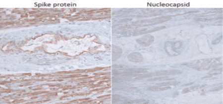 Siin näeme immunohistokeemiat, mida rakendatakse süstitud inimese südamelihaskoele. Oga-valgu olemasolu tõttu värvimine põhjustab tugeva pruuni pigmendi ladestumist. Seevastu nukleokapsiidi valgu ära tundva antikeha puhul täheldatakse ainult väga nõrka, mittespetsiifilist värvumist. Nukleokapsiidi puudumine näitab, et teravikvalgu ekspressioon tuleb omistada pigem vaktsiinile kui SARS-CoV-2 infektsioonile.