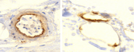 Me näeme oga-valgu ekspressiooni arterioolides (väikesed arterid; vasakul), samuti veenides (väikesed veenid) ja kapillaarides (paremal). Ekspressioon on kõige silmatorkavam sisemises rakukihis, endoteelis. See muudab endoteelirakud immuunsüsteemi rünnaku jaoks “pardid”.