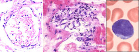Keskel olev pilt näitab veeni, mida immuunsüsteem ründab ja hävitab. Kontuurid on juba lahustumas ja spindlikujulised (ja paisunud) endoteelirakud on veresoone seinalt maha koorunud. Lisaks näeme lümfotsüüte – tumedate ümarate tuumadega väikseid rakke, mille ümber on väga vähe tsütoplasmat; üks lümfotsüüt (palju suurema suurendusega) on näidatud paremal.