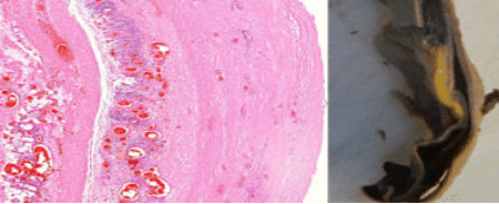 Vasakul lõik läbi aordi seina. See pilt on tehtud veelgi väiksema suurendusega kui eelmine; lümfotsüüdid paistavad nüüd vaid pisikeste siniste täppide pilvena. Sellest sinisest pilvest vasakul näeme vertikaalset pragu, mis läbib koe. Selline pragu on makroskoopiliselt nähtav ka paremal näidatud aordi väljalõigatud proovis.