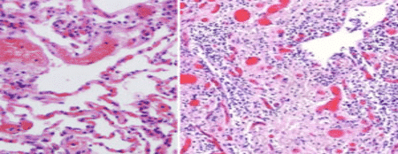 Paremal küljel näeme lümfotsüütide poolt ülekantud kopsukudet. Õhuga täidetud ruumid on suures osas kadunud ja täidetud armide (side)koega. Sellel vaktsiini süstitud patsiendil oleks ilmselgelt olnud väga suur hingamisraskus.