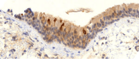 Slaidil on näha bronhide limaskesta proov patsiendilt, kes on elus, kuid kellel on vaktsineerimisest saadik olnud hingamisteede sümptomid. Me näeme kõige ülemises rakukihis mitut rakku, mis ekspresseerivad tugevalt oga-valku – ja seda isegi üheksa kuud pärast tema viimast vaktsiinisüsti! Kuigi see on tõepoolest kõige äärmuslikum pikaajalise ekspressiooni juhtum. Leidub tõendeid nii Burkhardti lahkamistest kui ka avaldatud uuringutest vereproovide [7] või lümfisõlmede biopsiate [8] kohta, mis näitavad, et ekspressioon kestab mitu kuud.