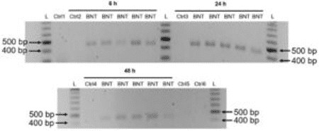 Kõiki BNT-ga märgistatud proove oli vaktsiiniga töödeldud ja need kõik näitavad eeldatava pikkusega PCR-produkti, nagu ilmneb võrdlusest DNA fragmendi pikkuse standardiga (“L”). Ctrl n-ga märgistatud proovid olid kontrollid: Ctrl 1–4 sisaldasid DNA-d rakkudest, mida ei inkubeeritud vaktsiiniga, Ctrl 5 sisaldas vaktsiiniga töödeldud rakkude RNA-d (mitte DNA-d); Ctrl 6 sisaldas sama, kuid seda töödeldi täiendavalt RNAaasiga, mis viidi läbi ka DNA proovide puhastamisel. Nagu oodatud, ei sisalda ükski kontrollproovist PCR produkti.