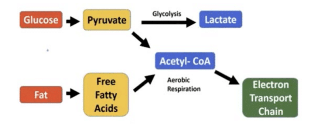Kui rasvade tarbimine on 15–40% ja glükoosi tarbimine on piisavalt suur, saab seda mitokondrites kütuseks põletada. See tekitab kuni 38 ATP-d glükoosimolekuli kohta. Selles protsessis toodetakse ka NADH ja CO2. 7