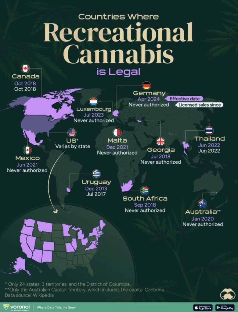 Siin kaardistab Visual Capitalisti Bruno Venditti Vikipeedia andmete põhjal riigid, kus kanepi meelelahutuslik kasutamine on alates 2024. aasta aprillist lubatud.