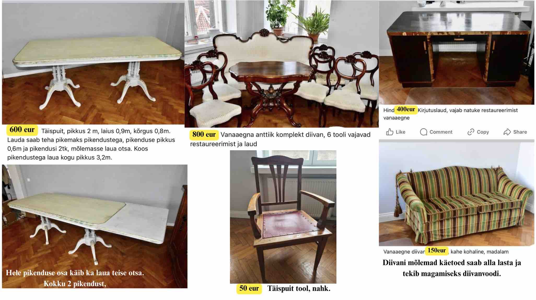 Kasutatud korralik antiikmööbel. Hinnad on kaubeldavad. Täispuit söögilaud koos pikendustega, hind 600 eur; Kanapee – laud, diivan, 6 tooli, hind 800 eur; täispuit kirjutuslaud 400 eur; täispuit tool 50 eur; diivan 150 eur. Kanapee ja kirjutuslaud vajavad pisiremonti. Kontakt: info@fonte.news