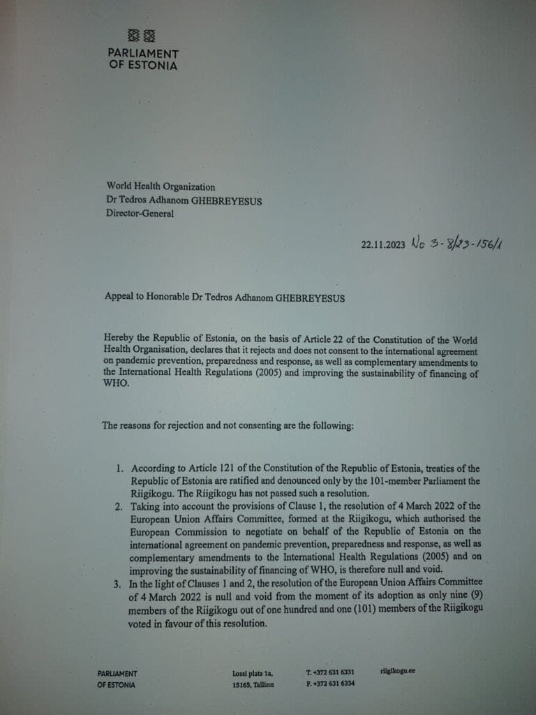 Käesolevaga Eesti Vabariik, tuginedes Maailma Terviseorganisatsiooni põhikirja artiklile 22 teatab, et lükkab tagasi ja ei anna nõusolekut pandeemiaks valmisolekut ja sellele reageerimist käsitleva rahvusvahelise kokkuleppe ning rahvusvaheliste tervise-eeskirjade (2005) täiendavate muudatuste ja WHO rahastamise jätkusuutlikkuse parandamisega.