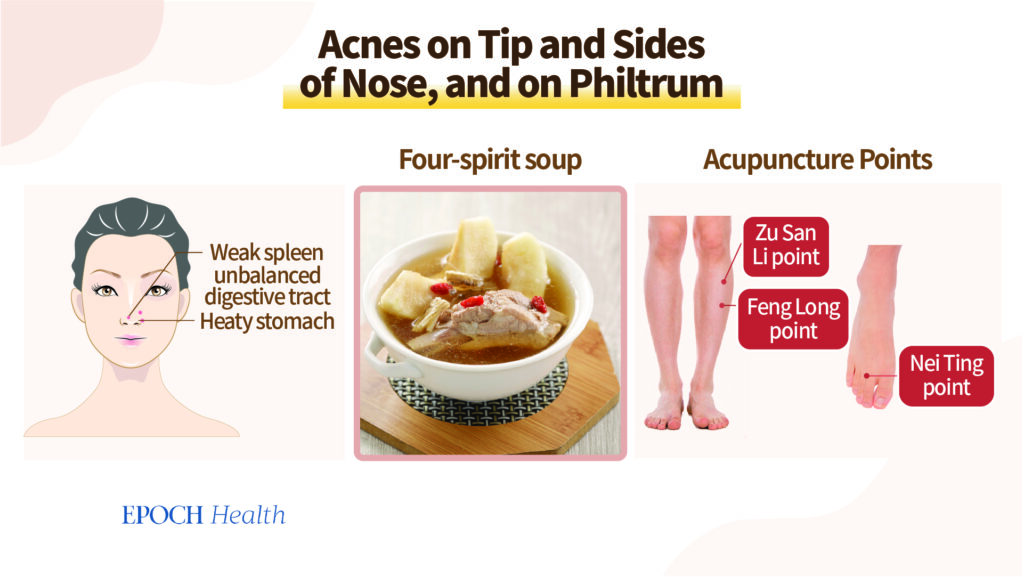 Need, kellel on akne ninal, võivad kannatada ka puhitus, maohappe tagasivool ja raskused roojamisega. Kõik need sümptomid on põhjustatud seedetrakti liigsest “niiskusest ja kuumusest”.