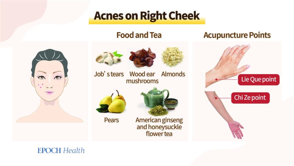 Lie Que punkti ja Chi Ze punkti masseerimine võib aidata kopse maha jahutada ja niisutada, et eemaldada akne paremal põsel.