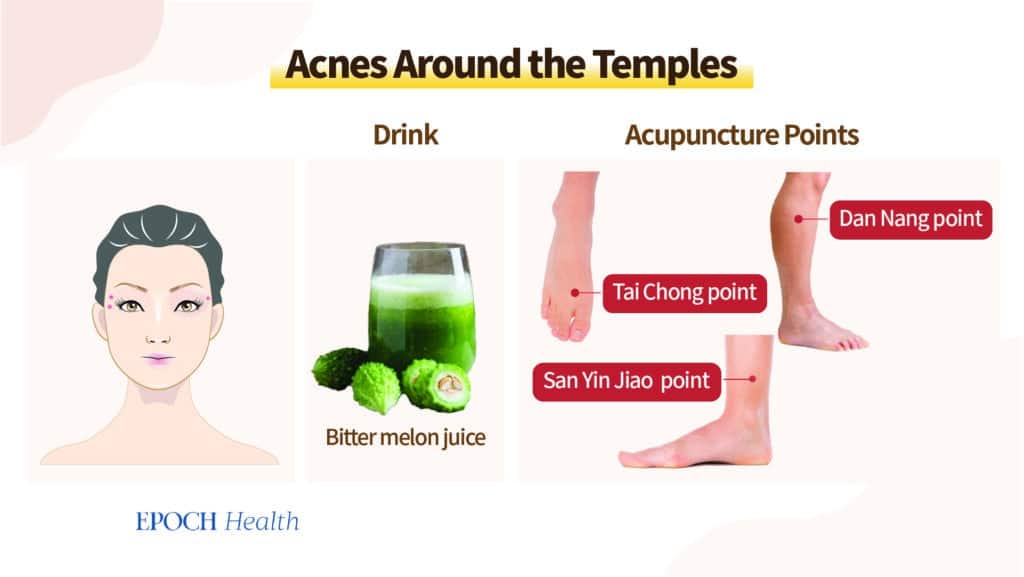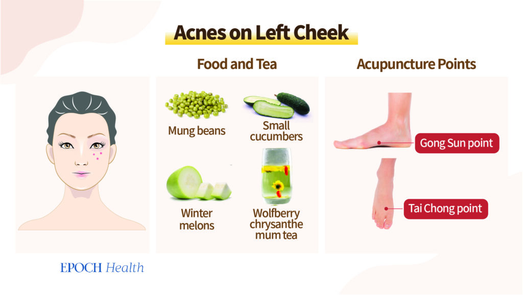 Traditsioonilise hiina meditsiini järgi võib vasaku põse akne raviks masseerida Gong Sun punkti ja Tai Chongi punkti.