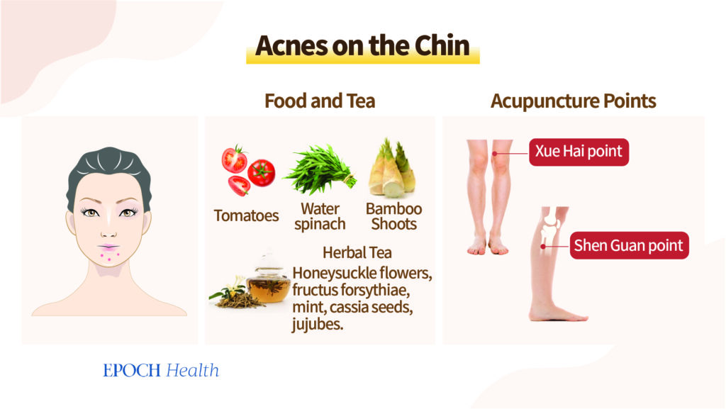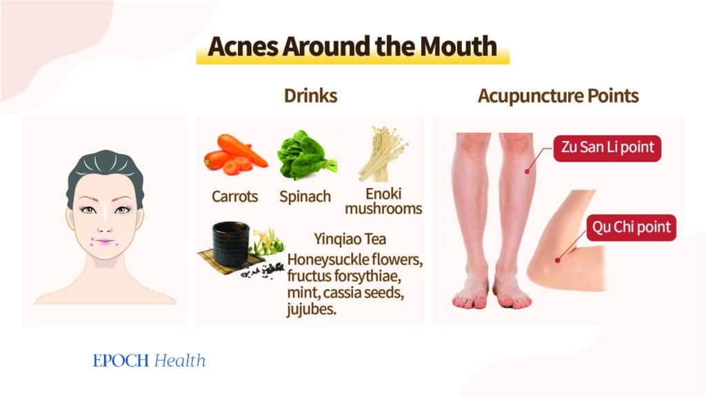 Inimesed, kellel on akne suuümbruses, võivad juua teed nimega Yin Qiao, mis koosneb kuslapuu õitest, fructus forsythiae (lianqiao), piparmündist, kassia seemnetest ja jujuobidest.
