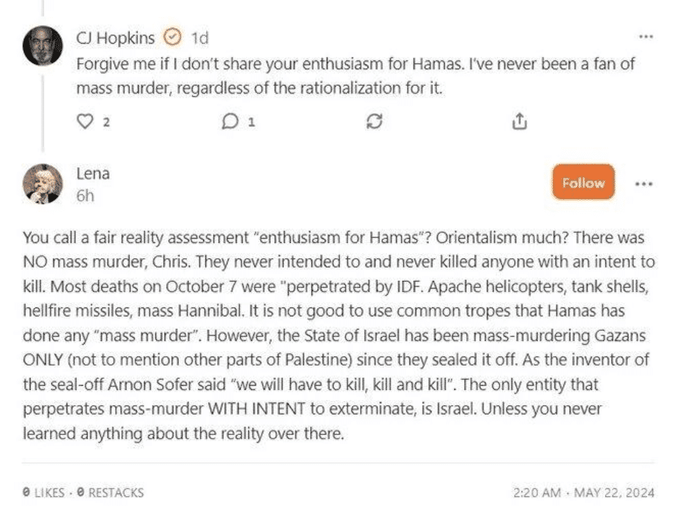 Seitse kuud olen jälginud, kuidas mu “radikaalsed” kolleegid üritavad seda fakti varjata. See ei ole kasulik. See ei aita kedagi. Palestiina rahvast see kindlasti ei aita. Iisraeli kohta on kritiseerimist enam kui küll. Valetamine, Hamasi puudutavate faktide väänamine, inimeste veenmine, et IDF “Hanniballis” kõiki 7. oktoobril, on (a) mittevajalik, (b) segane ja (c) hävitab teie usaldusväärsuse.