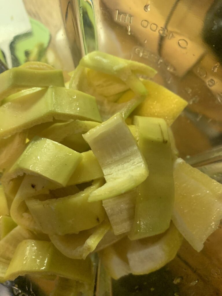 Sidrunid tükelda tervelt, koos koore ja kividega, kuueks tükiks ja pane tükid blenderisse. Koori banaanid, banaani koortel lõika varrejupp ja must ots ära ja tükelda banaanikoored tükkideks. Lisa tükeldatud koored blenderisse, kus ees ootavad sidrunitükid. Vala peale toasooja vett, umbes 250-300ml. Banaani viljaliha lõika viiludeks, pane kaanega karpi ja see sügavkülma. Saad igal ajal kasutada smuutide ja muude toitude tegemisel.
