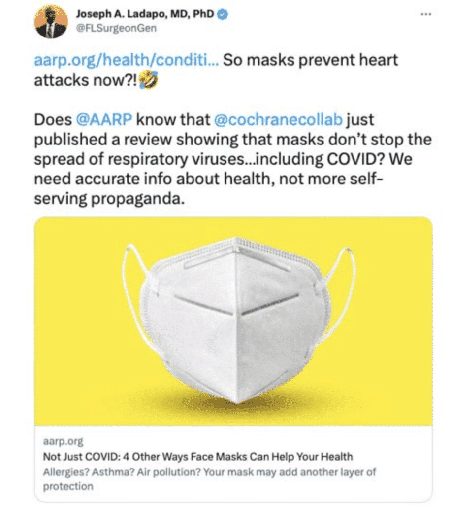 AARP (endine Ameerika Pensionäride Assotsiatsioon) läheb isegi nii kaugele, et väidab – maski kandmine võib aidata südameinfarkti ära hoida![3] Florida üldkirurgil dr Joseph Ladapol oli AARP-i katse kohta leiutada maskikandjatele eeliseid öelda järgmist:[4]