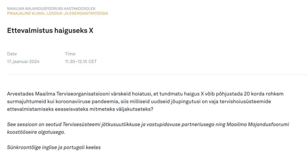 Davosis keskendutakse terve 1 päev selle viirus x teemal: “Arvestades Maailma Terviseorganisatsiooni värskeid hoiatusi, et tundmatu haigus X võib põhjustada 20 korda rohkem surmajuhtumeid kui koroonaviiruse pandeemia, siis milliseid uudseid jõupingutusi on vaja tervishoiusüsteemide ettevalmistamiseks eesseisvateks mitmeteks väljakutseteks?”