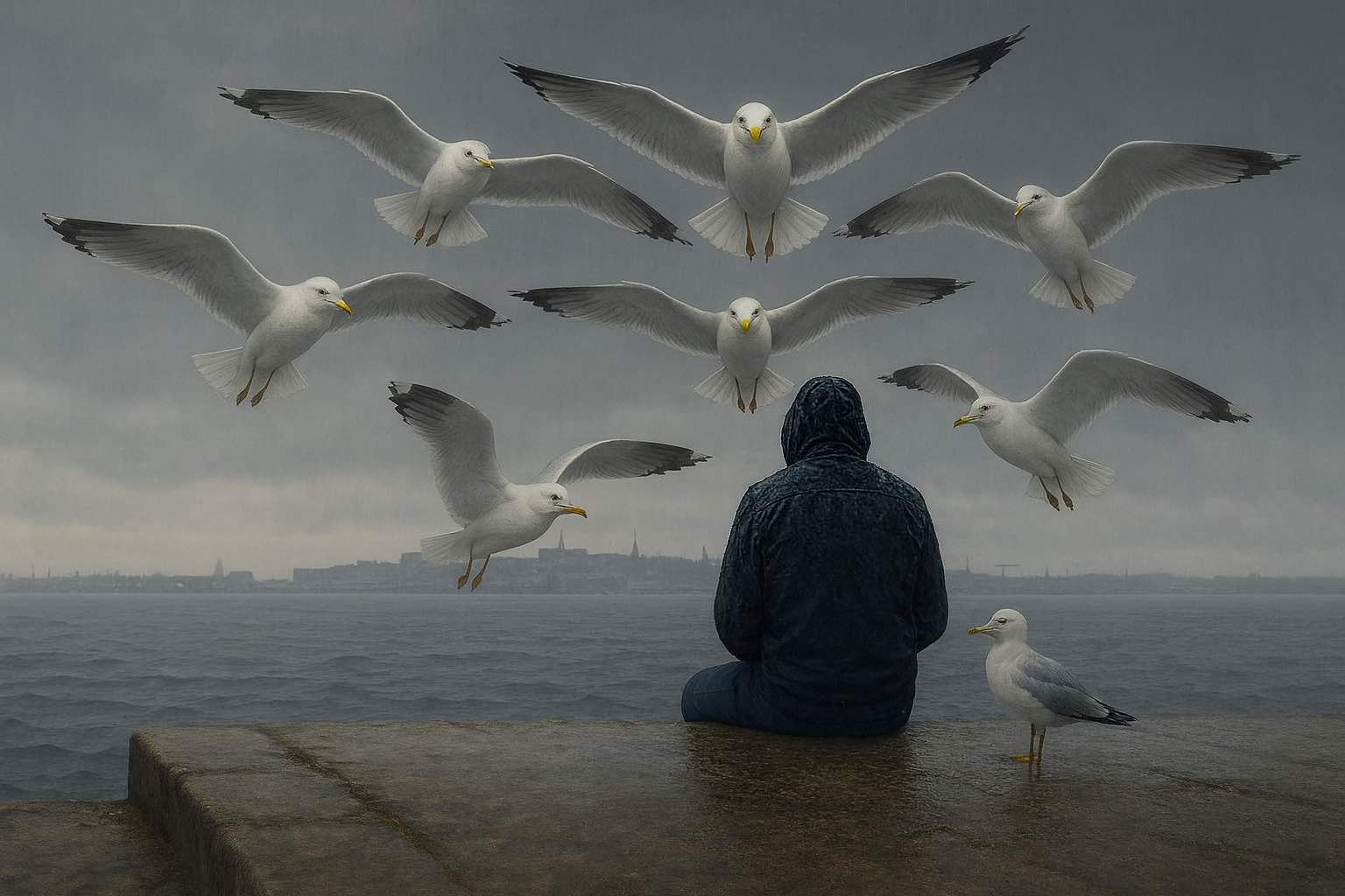 Topeltkinnitus saabus pööripäeval, 22.09.2025. Olin päikesetõusul Linnahalli kai ääres. Tugev tuul puhus. Istusin toolil, mediteerisin, ja kui lõpetasin, ilmus taas see sama kajakas. Kuid seekord polnud ta enam üksi – teda saatis terve parv. See väike kajakas lendas ees, nagu oleks ta grupi kokku kutsunud. Nad hõljusid otse minu kohal, vaid poole meetri kõrgusel, ja see sama väike kajakas vaatas mulle otse silma. Vaatamata tormisele tuulele püsis ta minu kohal, justkui jõuga paigal, ja vaatas mind. See kestis ligi 30 sekundit. Nad hõljusid koos, siis liikusid kaarega eemale.