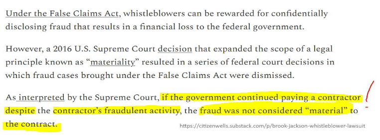 - 5. juuli 2022,CHD | Kaitsja: Pfizer palub kohtul rikkumisest teatajate kohtuasi tagasi lükata, kuna valitsus oli pettusest teadlik. Intervjuus Defenderile ütles vilepuhujat Brook Jacksonit esindav advokaat, Pfizer väidab, et kohus peaks tagasi lükkama Jacksoni kohtuasja, mis käsitleb pettust Pfizeri COVID-19 kliinilistes uuringutes, kuna USA valitsus teadis väärtegudest, kuid jätkas vaktsiinitootjaga äri tegemist; LOE