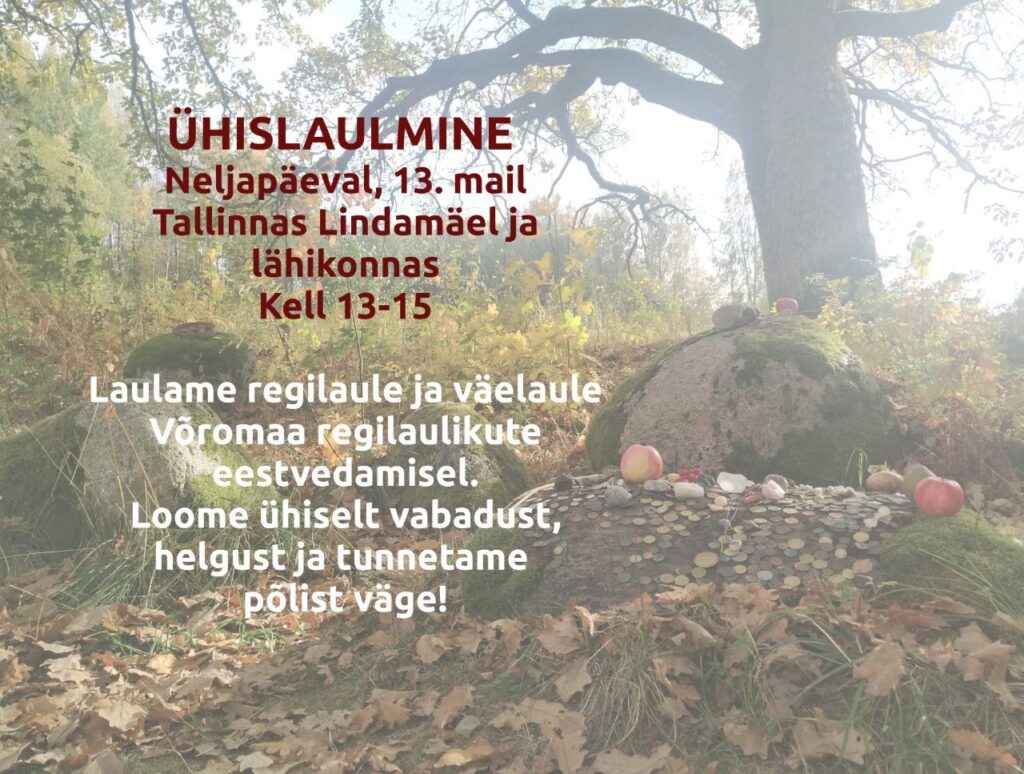 Tule meiega ühiselt uut elu looma neljapäeval, 13. mail Tallinnas Lindamäel ja lähikonnas kella ühe ja kolme vahel päeval. Laulame regilaule ja väelaule Võromaa regilaulikute eestvedamisel.