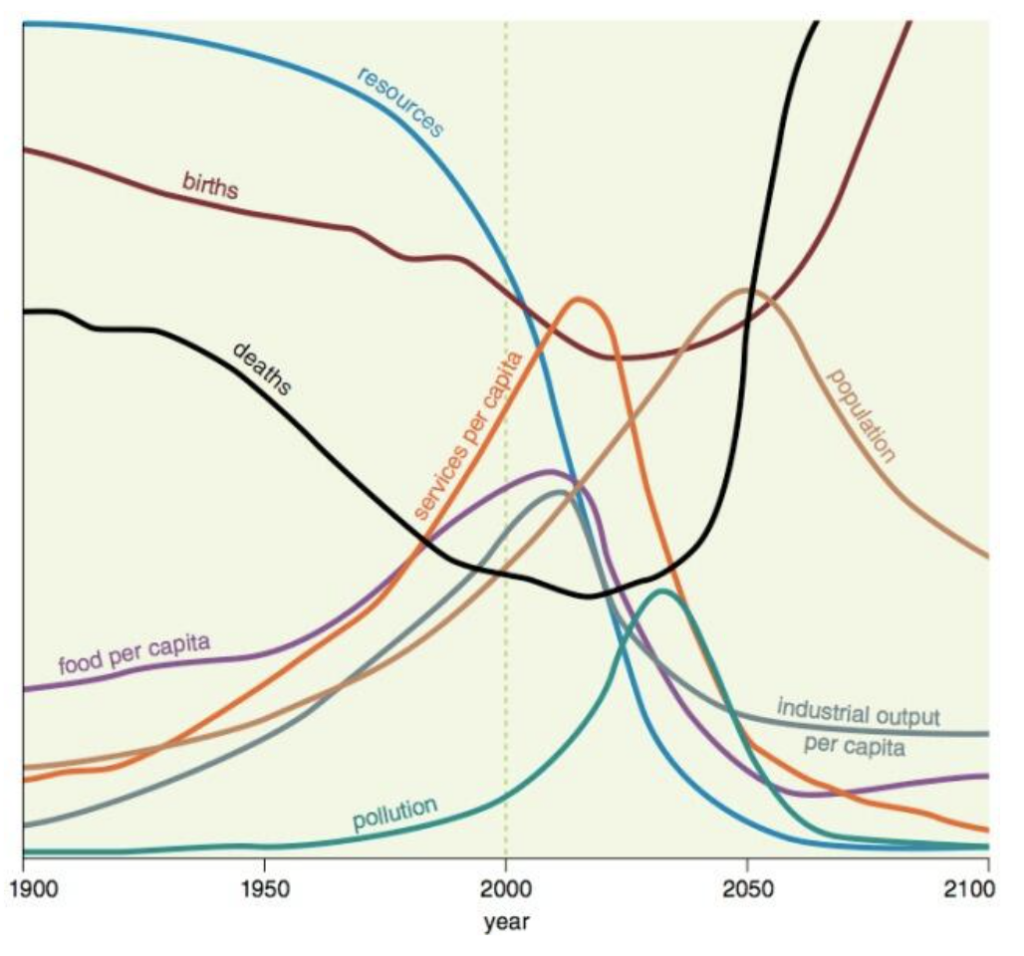 Tõde on see, et maailma kasvava rahvastiku ülalpidamiseks pole piisavalt ressursse. Oleme jõudmas pöördepunkti, kus kaupade ja teenuste koguhulk, mida maailma majandus suudab toota, hakkab peagi vähenema. (See ei erine ülaltoodud joonisel 4 modelleeritud olukorrast.)