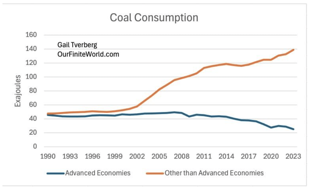 Osaliselt näib kliimamuutuste narratiiv olevat ettekääne, et viia tootmine arenenud majandustest riikidesse, kus kasutatakse laialdaselt kivisütt, kuna see kipub olema odav kütus. Viimati mainitud majandustes on ka madalam palga- ja hüvitiste tase, seega on olemas kindel kulueelis. Hiina ühines Maailma Kaubandusorganisatsiooniga 2001. aastal. Tulemust on lihtne näha allolevalt jooniselt 8. USA ekspordib nüüd kivisütt muu hulgas Indiasse ja Hiinasse.