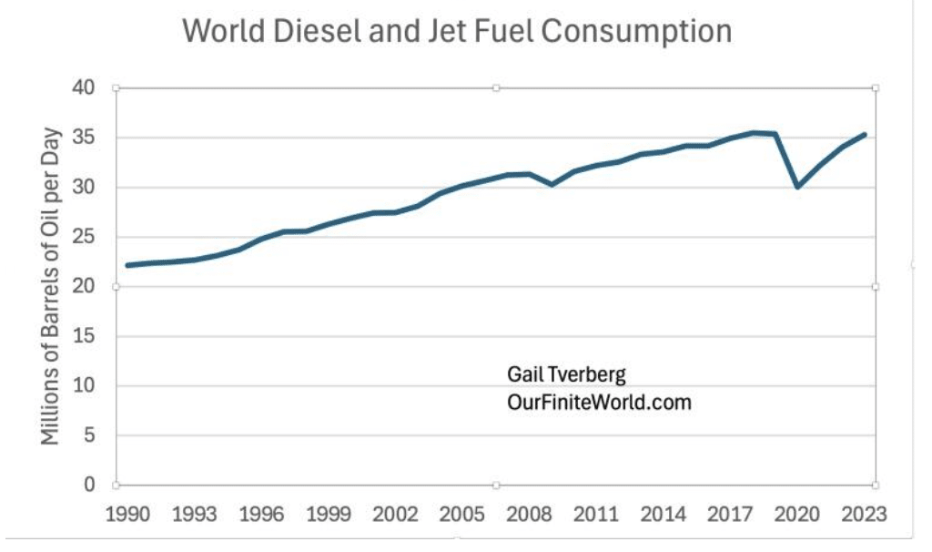 Aastatel 1990–2018 kasvas diislikütuse ja lennukikütuste tarbimine keskmiselt 1,7% aastas. Aastatel 2018–2023 ei ole tarbimine üldse kasvanud – tegelikult on maailma tarbimine 2023. aastal veidi väiksem kui 2018. aastal. Kui 1,7% aastas kasvumuster oleks jätkunud, oleks selle kütuste kombinatsiooni tarbimine kasvanud 8,8%. viieaastase perioodi jooksul 2018–2023.