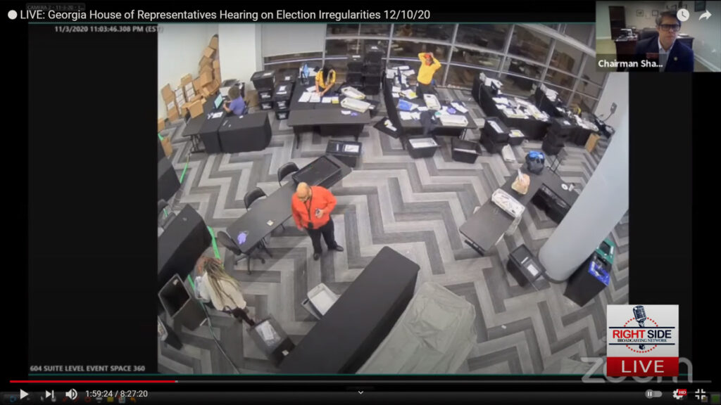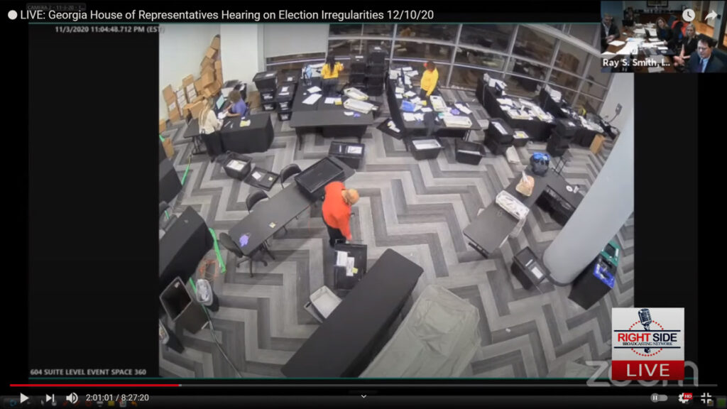 Valimispäev: Fultoni maakonna State Farm Arena turvakaamerate video näitab, kuidas Fultoni maakonna valimistöötaja asub lühikesse vestlusse meedia esindajate ja vaatlejatega, kes peale seda panid asjad kokku ja lahkusid. See klapib meedia teadetega, et kõigil kästi hoonest lahkuda õhtul kella 22 paiku. Valimistöötajate tunnistuste põhjal öeldi neile, et häälte lugemine selleks õhtuks lõpetatakse ja jätkatakse hommikul.