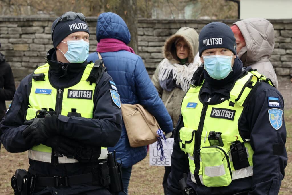 Eile, 13. aprillil, laulis Toompeal regilaulik Helena Trei, kes sai enne laulmaminekut kõne politseist küsimusega, kas ta ikka tõesti tahab sinna laulma minna? (Olgu öeldud, et Helena sellest kusagil avalikult rääkinud ega inimesi kokku kutsunud ei ole, järelikult on meil tegemist salajase jälitustegevusega ehk kuulatakse pealt inimeste privaatkõnesid.) Helena on üks rahumeelsemaid ja leebemaid inimesi, keda tean. Helena vastas, et me hoiame seal ju kõik distantsi ning ta ei näe põhjust, miks ta ei võiks ennast laulmise kaudu väljendada. Ja tõesti, me hoidsime kõik vajalikku distantsi, seega me tõesti ei ohustanud mitte kedagi ega midagi. Võrreldes pühapäevase horror-etendusega olid Toompeal teisipäeval kõigest paarkümmend politseinikku, kel aga kummalisel kombel ei olnud rinnal enam nimesilte, vaid üksnes numbrid. Helena laulmise alguses seisid tema lähedale kaks ähvardavate näoilmetega politseinikku, nagu oleks tegemist potentsiaalse kurjategijaga. Läksin ja seisin Helena ja mundrimeeste vahele, et Helenal oleks rahulikum laulda. Üks politseinik filmis mind oma rinnakaameraga demonstratiivse pealetükkivusega, aga ma ei lasknud end sellest häirida. Naeratasin ja alustasime laulmist. Teise laulu ajal tundsid politseinikud end ilmselt siiski ebakohaselt ja lahkusid meie nina alt. Tegemist oli siin pildil jäädvustatud politseinikega.