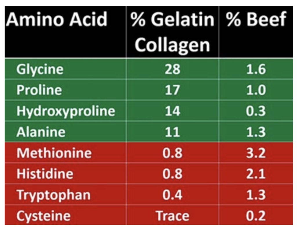 Nagu näete allolevast tabelist, sisaldab veiseliha väga vähe aminohappeid, mis on vajalikud sidekoe tervise jaoks. Niisiis, veiseliha üksi ei võimalda teil luua tugevat sidekude ja säilitada luude tugevust.