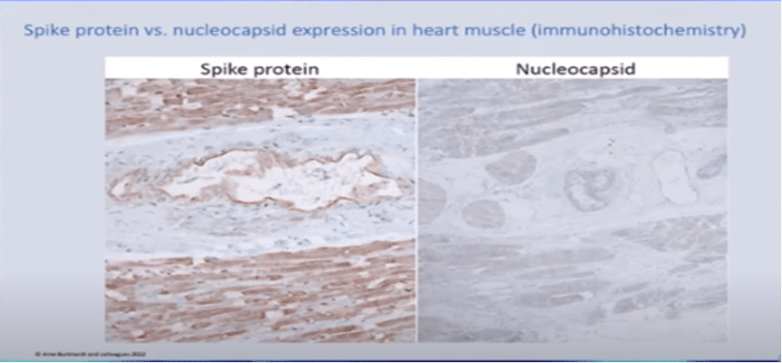 Allpool on pilt ogavalgust südamelihases (vasakpoolne pilt), mida dr Cole jagas. Pruun värv on ogavalk, mis on ogavalgu tuvastamiseks värvitud konkreetse plekiga. Parempoolsel pildil on viiruse N-valk, mis on N-valgu tuvastamiseks siniseks värvitud erineva plekiga. Kui ogavalk on viirusest, ilmuvad mõlemad plekid, st pildil on nii pruunid kui ka sinised täpid. Niisiis, kui vasakpoolsel pildil näidatud ogavalk oleks pärit viirusest, siis ilmuks pildile ka sinine plekk – kuid see ei ole nii. Vasakpoolne pilt on seega ogavalgud, mille on indutseerinud “vaktsiin”.