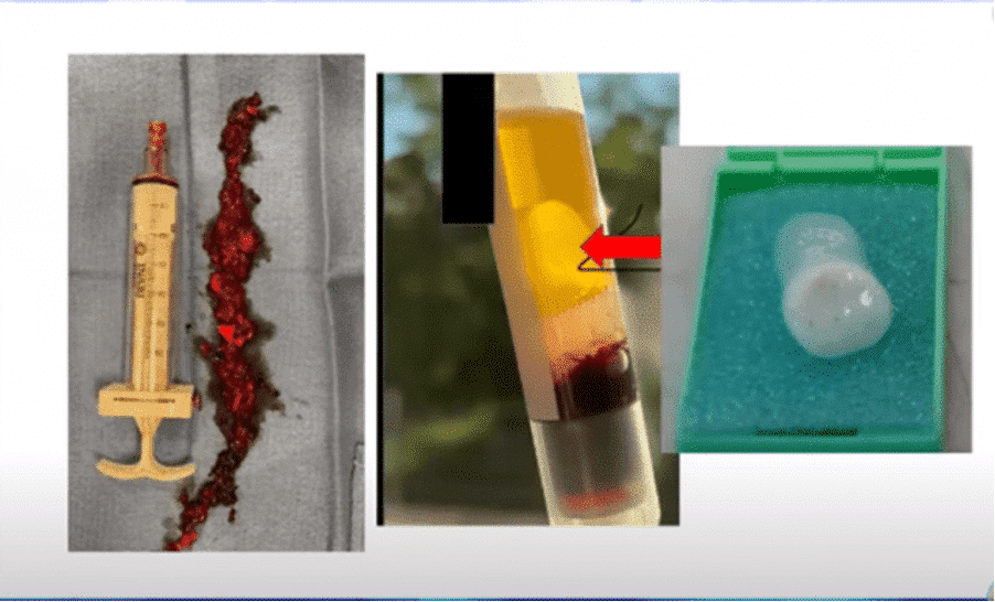 Alloleval pildil olevad trombid on pärit elavatelt patsientidelt. Niisiis, neid pakse kiulisi trombe, mis on moodustumise protsessis, leidub nii elavatel patsientidel kui ka palsameerijate poolt. Keskel olev pilt on vereproov, mis on võetud Saksamaal patsiendilt, kellele oli süstitud kolm Covidi “vaktsiini” annust. Pärast proovi võtmist hakkas see moodustama fibrille. Niisiis, teadlased “keerutasid selle maha” ja paremal oleval pildil olev tükk tuli välja. Tükk on valmistatud samadest komponentidest nagu kiulised trombid.