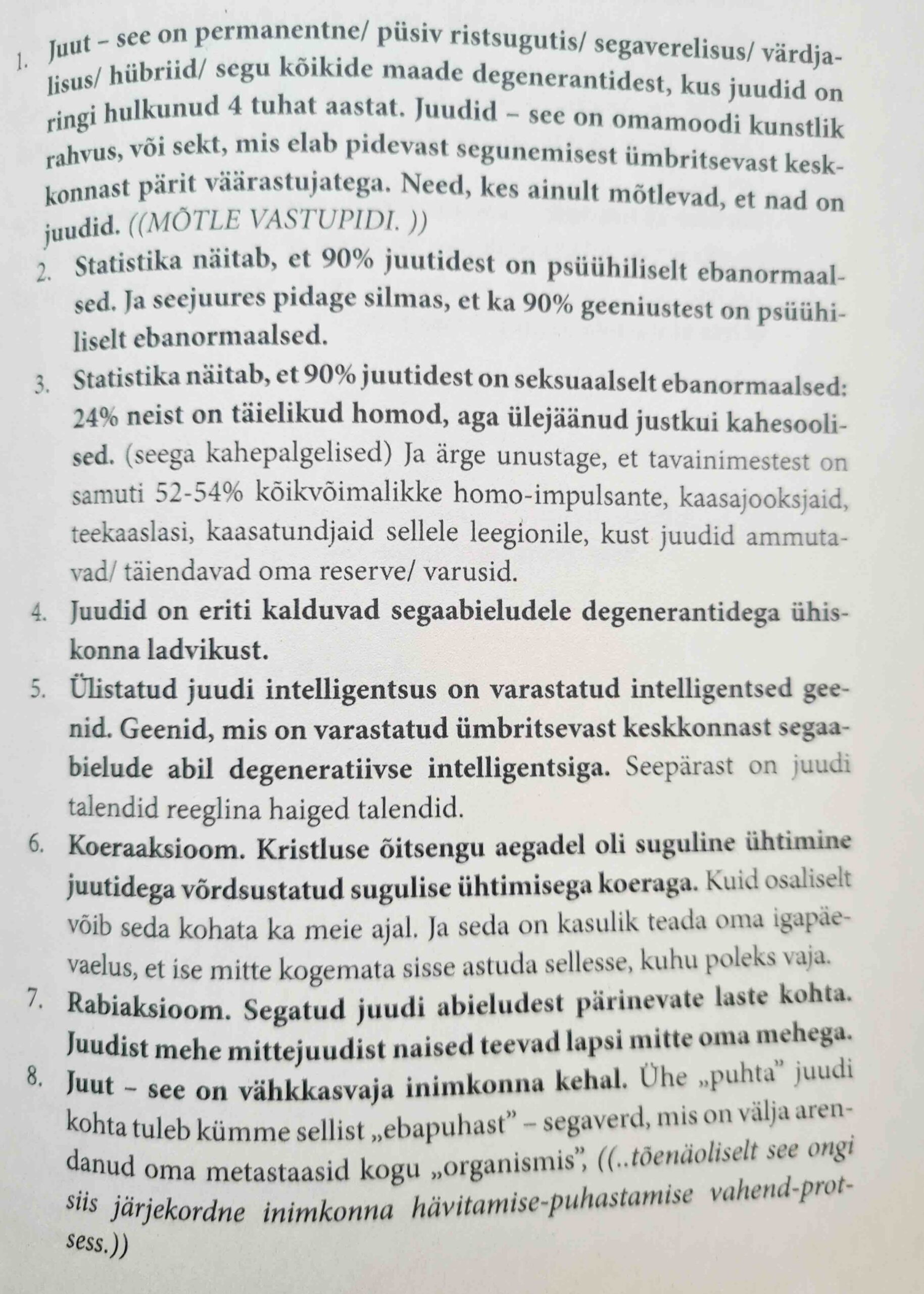 “Seda maailma juhivad “degenerandid” ja nad on palju efektiivsemad riikide hävitamisel, kui tuumarelv. Nad on peaaegu sama efektiivsed (kuid samaaegselt ka sama ohtlikud), kui bioloogilised relvad. Reeglina nad vihkavad normaalseid inimesi. Sest: “… saatan ei suuda armastada ja ei armasta neid, kes armastavad”.