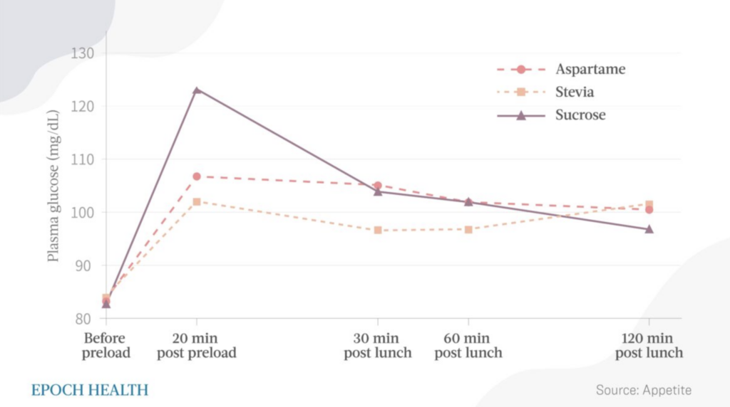 Florida ülikooli teadlased viisid läbi katse , milles 31 täiskasvanud osalejat paastusid 12 tundi ja sõid sama hommikusööki. Kakskümmend minutit enne lõuna- ja õhtusööki anti neile teed ja suupisteid, mis sisaldasid sahharoosi, aspartaami või steviat, teadmata, millist suhkrut nad sisse söövad. Seejärel võisid nad oma soovi järgi lõuna- ja õhtusööki süüa.