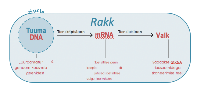 Transkriptsiooniks nimetatavas protsessis kopeeritakse DNAs asuvad geenid vastavate tähtedega mRNAsse. mRNA väljub tuumast, kus ribosoomid saavad seda lugeda ning selle translatsiooniks nimetatava protsessi teel valguks muundada. DNAd võib võrrelda kokaraamatuga, mRNAd konkreetse retseptiga ning valku küpsetatava koogiga.