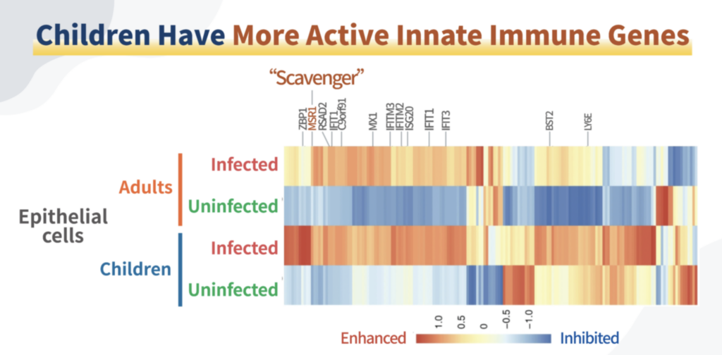 Nakatunud lastel aktiveeritakse makrofaagide püüdja retseptori 1 geen (MSR1) väga kõrgel määral. Lisaks, kuna laste kaasasündinud immuunsus on oma olemuselt tugev, aktiveeriks see neid geene veelgi, võimaldades organismil võõrpatogeene tõhusamalt hävitada.