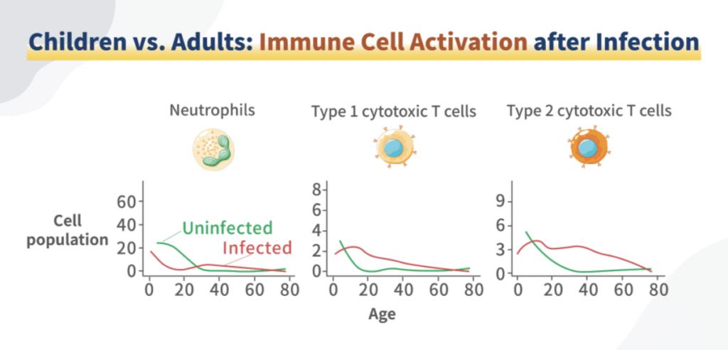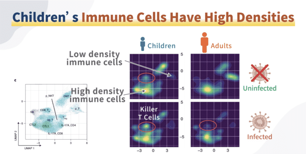 Lastel on tugevam kaasasündinud immuunsus. Alates pandeemia puhkemisest on teadlased märkinud, et lastel on viiruse vastu suurem kaitse kui täiskasvanutel. Teises ajakirjas Nature avaldatud artiklis võrreldi ja analüüsiti mitmete tüüpiliste rakurühmade erinevusi laste ja täiskasvanute vahel: