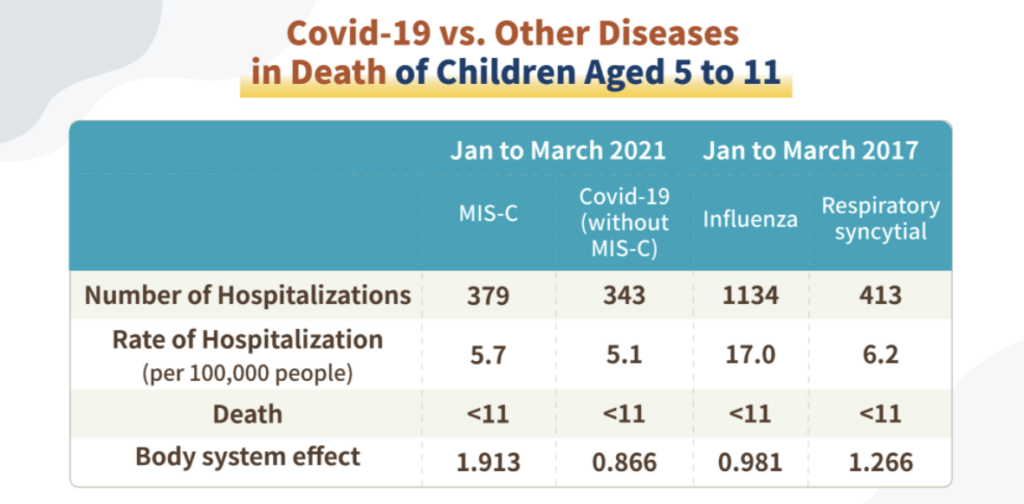 COVID-19 põdenud 5–11-aastaste laste haiglaravi kogukestus oli lühem kui gripi ja respiratoorse süntsütiaalviirusega haiglaravi puhul. Oluline on märkida, et mõnedel COVID-19 nakkusega lastel areneb välja multisüsteemne põletikuline sündroom (MIS-C), mis on aeg-ajalt ja enamasti ravitav. Siiski nõuab see siiski hoolikat jälgimist ja kiiret arstiabi, kui COVID-19 nakkusega lapsel tekivad elundite ja/või kudede põletiku sümptomid.